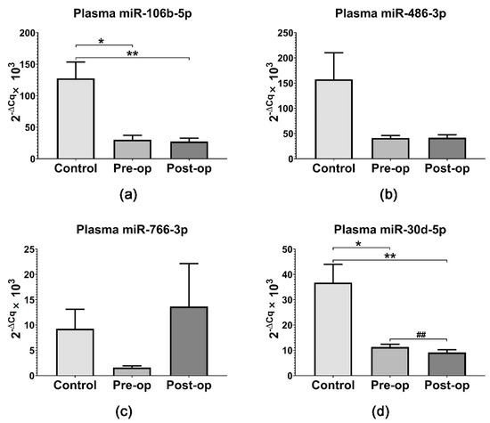 Relative expression (2−ΔCq × 103) of selected miRNAs in plasma from GB patients and Control subjects: (a) miR-106b-5p; (b) miR-486-3p; (c) miR-766-3p; (d) miR-30d-5p. Data are represented as means ± standard error of the mean. * p < 0.05, ** p < 0.01 (One-Way ANOVA with Tukey’s multiple comparisons test), ## p < 0.01 (paired t-test Pre-op vs. Post-op).