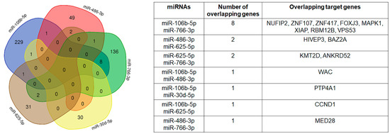 We performed miRNA target genes’ prediction for miR-106b-5p, miR-486-3p, miR-766-3p, miR-30d-5p and miR-625-5p using the miRWalk algorithm [49]. The analysis returned the validated target genes for the five selected miRNAs: 240 for miR-106b-5p, 53 for miR-486-3p, 147 for miR-766-3p, 31 for miR-30d-5p and 36 for miR-625-5p. Overlapping of target genes occurred between a maximum of two miRNAs, as shown in Figure 7.