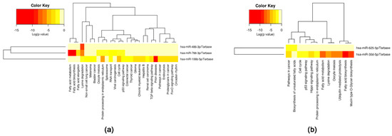 Heatmaps of significant pathways predicted by DIANA-miRPath for: (a) miR-106b-5p, miR-486-3p and miR-766-3p; (b) miR-30d-5p and miR-625-5p.