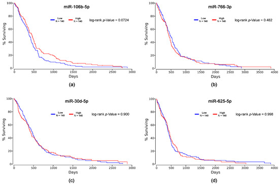 Kaplan–Meier curves and log-rank p-values for: (a) miR-106b-5p; (b) miR-766-3p; (c) miR-30d-5p; (d) miR-625-5p.