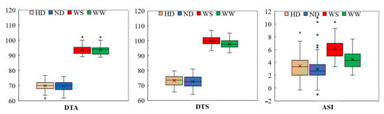 The boxplots of the phenotypic distribution of all of the 12-target trait-environment combinations between the three target traits, i.e., DTA (day); DTS (day); ASI (day) and the four evaluation conditions including well-water (WW); water-stress (WS); normal density (ND); and high density (HD).