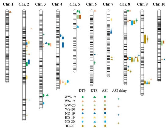 QTLs identified for ASI-delay caused by water stress and high planting density during 2019 and 2020.