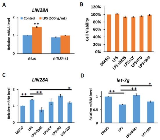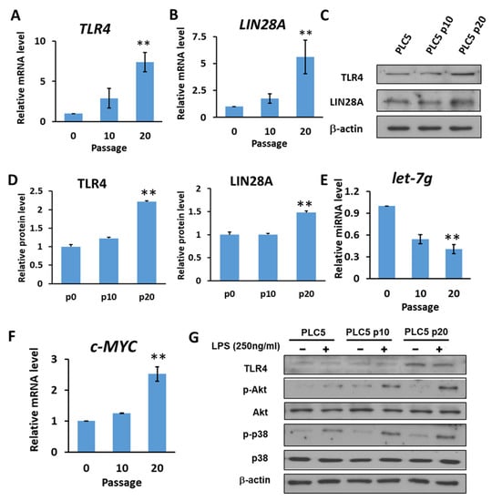 2.4. HCC with Long-Term TLR4 Activation Leads to Upregulation of TLR4 and LIN28A and Downregulation of Let-7g miRNA