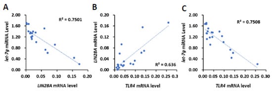 2.3. Analysis of the Correlation between TLR4 and LIN28A/Let-7g Axis in HCC Clinical Samples