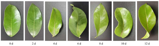 Leaf phenotype of ‘Huaizhi’ litchi trees under chilling stress. ‘Huaizhi’ litchi trees were transferred to a growth chamber. Temperature of the chambers dropped from 22 °C/17 °C (day/night temperature, 12 h day and 12 h night) to 2 °C in 4 days, and then remained at 2 °C for another 8 days. The days represent the samples of ‘Huaizhi’ litchi leaves on 0 d, 2 d, 4 d, 6 d, 8 d, 10 d, and 12 d under low-temperature conditions.