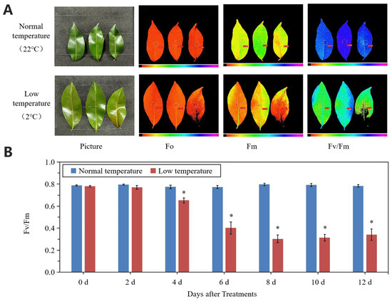 Changes in leaf chlorophyll fluorescence parameters under normal- and low-temperature conditions. (A) Phenotype and chlorophyll fluorescence imaging for parameters Fo, Fm, and Fv/Fm for leaves of ‘Huaizhi’ at normal temperature as control and low temperature as treatment at the time point of day 12. (B) Fv/Fm values of litchi leaves under low-temperature and normal-temperature conditions. Asterisks (*) indicate significant difference between treatment and control at the same time point (p ≤ 0.05, n = 3, Student’s t-test).