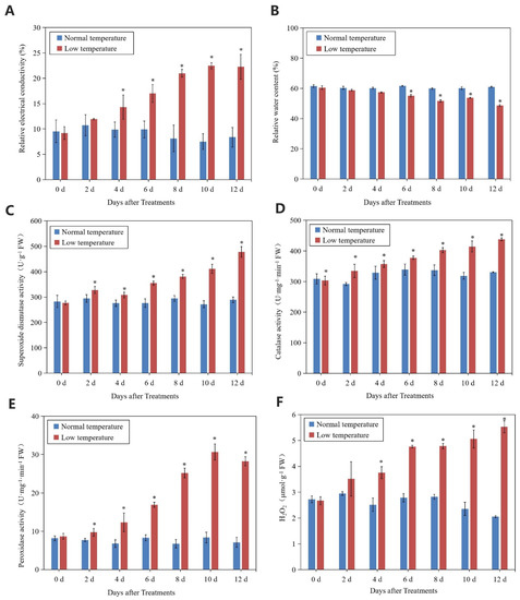 Changes in relative conductivity (A), relative water content (B), SOD activity (C), CAT activity (D), POD activity (E), and H2O2 content (F) of leaves in ‘Huaizhi’ litchi trees under normal- and low-temperature conditions. ‘Huaizhi’ litchi trees were transferred to a growth chamber. Temperature of the chamber dropped from 22 °C/17 °C (day/night temperature, 12 h day and 12 h night) to 2 °C in 4 days, and then remained at 2 °C for another 8 days. Asterisks (*) indicate significant difference between low temperature as treatment and normal temperature as control at the same time points (p ≤ 0.05, n = 3, Student’s t-test).