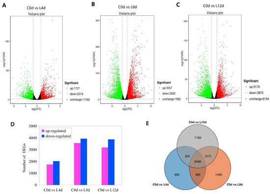 Differentially expressed genes (A–D) and Venn diagram of the DEGs (E) in response to chilling stress. ‘Huaizhi’ litchi trees were grown in a chamber with 22 °C/17 °C (day/night temperature, 12 h day and 12 h night) as the normal temperature. Temperatures dropped from the normal one to 2 °C for 4 d, and then were maintained at 2 °C for another 8 d. C0d, L4d, L8d, and L12d mean the leaves samples at 0 d, 4 d, 8 d, and 12 d of chilling stress.