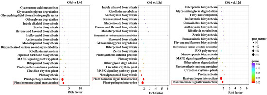 For KEGG pathway analysis, we found that the plant hormone signal transduction pathway was enriched in the DEGs between 0 d and 4 d, 0 d and 8 d, and 0 d and 12 d (Figure 5).
