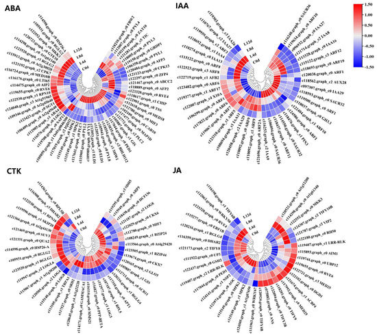 From the 2496 CRGs, we screened those related to plant hormone signal transduction pathways (plant hormone signal transduction, ko04075), of which, 54 were related to abscisic acid signaling (ABA-DEGs), 40 were related to auxin signaling (IAA-DEGs), 37 were related to cytokinin signaling (CTK-DEGs), 27 were related to ethylene signaling (ETH-DEGs) (Figure 6), 21 were related to brassinolide signaling (BR-DEGs), 13 were associated with gibberellin signaling (GA-DEGs), 35 were associated with jasmonic acid signaling (JA-DEGs), 29 were associated with salicylic acid (SA-DEGs), and 4 were associated with strigolactone signaling (SL-DEGs) (Figure 7; Table S2).
