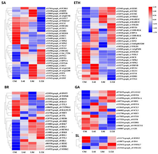 Heat map diagram showing the expression profiles of the SA-, ETH-, BR-, GA-, and SL-DEGs under low-temperature conditions. ‘Huaizhi’ litchi trees were grown in a chamber with 22 °C/17 °C (day/night temperature, 12 h day and 12 h night) as the normal temperature. Temperatures dropped from the normal one to 2 °C for 4 d, and then were maintained at 2 °C for another 8 d. C0d, L4d, L8d, and L12d mean the leaves samples at 0 d, 4 d, 8 d, and 12 d of treatment. Fragments per kilobase of transcript per million mapped reads (FPKM) values were normalized to Z-score.