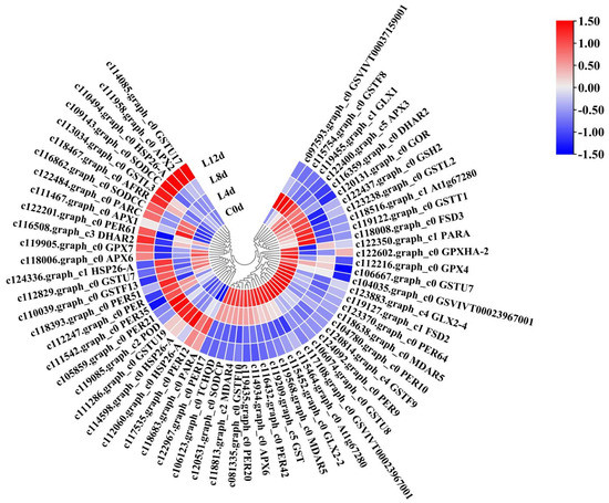 Heatmap of the antioxidant system-related DEGs in response to low-temperature in litchi. ‘Huaizhi’ litchi trees were grown in a chamber with 22 °C/17 °C (day/night temperature, 12 h day and 12 h night) as the normal temperature. Temperatures dropped from the normal one to 2 °C for 4 d, and then were maintained at 2 °C for another 8 d. C0d, L4d, L8d, and L12d mean leaves samples at 0 d, 4 d, 8 d, and 12 d of treatment. Fragments per kilobase of transcript per million mapped reads (FPKM) values were normalized to Z-score.
