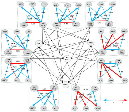 A graph of the Partial Least Squares Structural Equation Modeling (PLS-SEM). The center part of the graph is based on the other nine parts around it. Levels of the path coefficients are reflected by the width of the red or blue arrows which indicate positive and negative effects, respectively. Values on the arrow indicate the intensity of the factor loading for the pathway. Pathways from hormone-related DEGs to transcription factor-encoding DEGs are first orders, while those from transcription factor encoding DEGs to antioxidant-related CRGs are second orders.