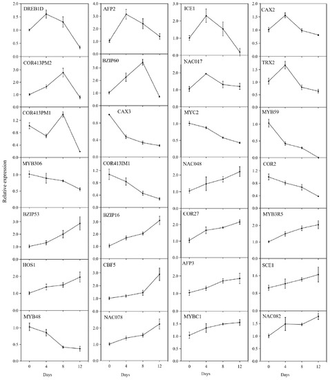 In order to confirm the RNA-Seq data, we randomly selected 28 DEGs for qRT-PCR verification. As shown in Figure 10, the relative expression levels of LcDREB1D, LcAFP2, LcICE1, LcCAX2, LcNAC017, and LcTRX2 increased then decreased during the chilling treatment. The relative expression levels of LcBZIP53, LcBZIP16, LcCOR27, LcMYB3R5, LcHOS1, LcCBF5, LcAFP3, LcSCE1, LcNAC048, LcNAC078, LcMYBC1, and LcNAC082 showed increasing trends.