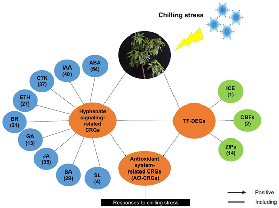 A proposed model for litchi in response to chilling according to the Partial Least Squares Structural Equation Modeling analyses. Details of the co-expression network of three identified cold-responsive genes and associated hormones are shown. The numbers in the brackets represent the number of the identified chilling responsive genes (CRGs) under the specific items.
