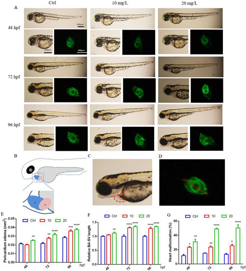 42], zebrafish developed to 48, 72, and 96 hpf were anesthetized with tricaine (0.168 g/L) and placed on the grooved slide, ensuring that the two eyes were coincident so that the zebrafish heart was clearly visible. The developmental status of zebrafish, especially the heart, was observed and photographed using a stereofluorescence microscope. The area of pericardial edema and the distance between venous sinus (sinus venosus (SV)) and arterial sinus (bulbus arteriosus (BA)) of zebrafish in different treatment groups were measured by ImageJ software, and the heart malformation rate was calculated based on the above two parameters. Each step involved was tested three times with different batches of embryos, each with 15–20 zebrafish per group.