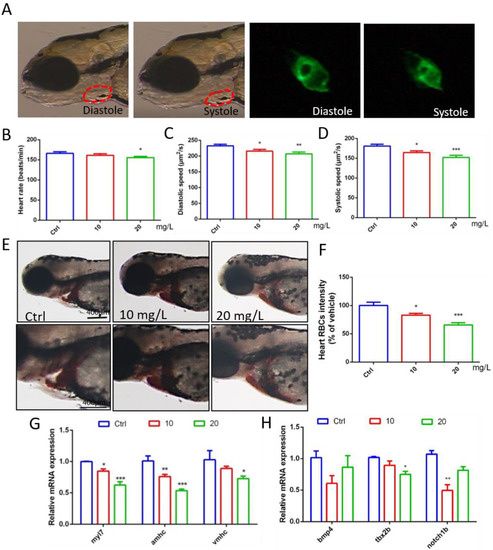 43], and 60 hearts of larvae developing to 72 hpf were randomly selected from each group and placed in 1.5 mL centrifuge tubes. Total RNA was extracted using TRIzol Reagent (Leagene, Beijing, China) according to the instructions, and cDNA was synthesized by reverse transcription using a PrimeScript RT kit (Takara, Beijing, China). Real-time quantitative PCR was performed in the Multicolor Real-Time PCR Detection program using the SYBR Green labeling system. The reaction conditions were as follows: 50 °C for 2 min, 95 °C for 10 min; 95 °C for 30 s, 60 °C for 1 min, 40 cycles. Thirty larvae from each group developed to 72 hpf were extracted for total RNA and then performed real-time fluorescence quantitative PCR of other genes. The β-actin gene was used to normalize the data. The corresponding primer sequences of the target genes were listed in