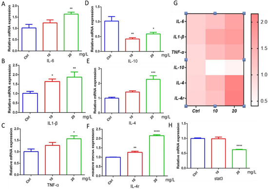 30]. In our experiment, the mRNA levels of the proinflammatory factors IL-6, IL1-β, and TNFα in zebrafish were upregulated by 6-BA, and the transcription of the anti-inflammatory factors IL-10 and IL-4 and the receptor IL-4r were also changed to varying degrees, indicating that there was a serious inflammatory response in zebrafish treated with 6-BA. The target gene