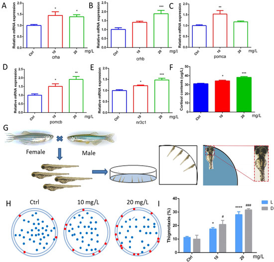 37]. These behavioral changes were also associated with changes in cortisol levels, as observed in 6-BA-treated larvae: as 6-BA concentrations increased, zebrafish had higher cortisol levels and more obvious tropism. Several studies have reported correlations between systemic cortisol levels and behavioral changes in response to exposure to toxins [