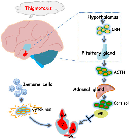 5]. Specifically, the hypothalamus secretes corticotropin-releasing hormone (CRH), which in turn acts on the pituitary to release adrenocorticotropic hormone (ACTH). ACTH then acts on the adrenal gland to secrete glucocorticoid (GC), which modulates HPA axis activity through the glucocorticoid receptor (GR or nr3c1) [