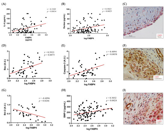 Given the higher expression of FABP4 in male AVs, we investigated the possible correlations between protein levels of FABP4 and markers assessing inflammation, apoptosis, and calcification in the male AVs. FABP4 was directly correlated with the inflammatory markers IL-6 (r = 0.3389, p = 0.0034) and Rantes (r = 0.3023, p = 0.0025) (Figure 3A,B). Co-expression of FABP4 with Rantes visualized by immunohistochemistry reinforced this association (Figure 3C). The pro-apoptotic markers Bax and caspase-3 directly and significantly correlated with the FABP4 levels (r = 0.3933, p = 0.0075, and r = 0.4094, p = 0.0058, respectively) (Figure 3D,E). Moreover, a co-localization of FABP4 and caspase-3 was found in the AV sections (Figure 3F). The anti-apoptotic marker Bcl-2 was inversely correlated with FABP4 (r = −0.4096, p = 0.0246) (Figure 3G). Finally, the calcification markers BMP-2 (r = 0.3032, p = 0.0024), IL-8 (r = 0.3126, p = 0.0043), and BMP-4 (r = 0.2774, p = 0.0385) presented direct correlations with the FABP4 levels in the AVs analyzed (Figure 3H,J,K). In agreement with these results, FABP4 was co-expressed with BMP-2 and BMP-4 in male AVs (Figure 3I,L). In relation to AVs in females, we did not find any of these significant associations (data not shown).