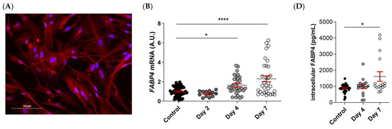 FABP4 was spontaneously expressed in VICs from AS patients, as evidenced by immunofluorescence (Figure 4A). Male and female VICs were cultured in osteogenic media for 2, 4, and 7 days. The mRNA expression levels of FABP4 increased significantly at days 4 and 7 only in the male VICs (Control: 1 ± 0.07 vs. d4: 1.165 ± 0.16; p < 0.05, and d7: 2.3 ± 0.31; p < 0.0001) (Figure 4B). In female VICs, the FABP4 mRNA was slightly but not significantly increased by osteogenic treatment (Figure 4C). Consistently, intracellular and extracellular FABP4 protein levels were determined only in male VICs at 4 and 7 days of treatment. Both the FABP4 expression and secretion increased significantly after 7 days of culture in the osteogenic medium (intracellular, Control: 877 ± 45 vs. d7: 1614 ± 297 pg/mL; p = 0.0235; extracellular, Control: 155 ± 13 vs. d7: 366 ± 44 pg/mL; p < 0.0001) (Figure 4D,E). Given that both intracellular and extracellular expression of FABP4 was consistently up-regulated only at day 7, any further experiment on calcifying VICs was conducted at the aforementioned timepoint.