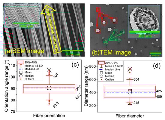 (a) shows the SEM images of aligned fibers having inset with lower magnification. (b) shows a cross-sectional TEM image of PLA-PANi:CSA fibers with φPANi ≈ 7% concentration of filler; A: PLA-PANi:CSA fibers; B: artifacts from sample preparation. Inset shows a cross-sectional image of a single fiber. (c,d) show the directionality and diameter analysis with box plot analyses, respectively. The box outline is the interquartile range, the square and circle inside the box are the mean and median data points, the lines inside the box (red line and blue dash-dotted line) are the mean and median data locations, and the whiskers display the upper inner and lower inner fence values. Above and below the whiskers: (−) maximum/minimum data point and (×) 99th percentile.