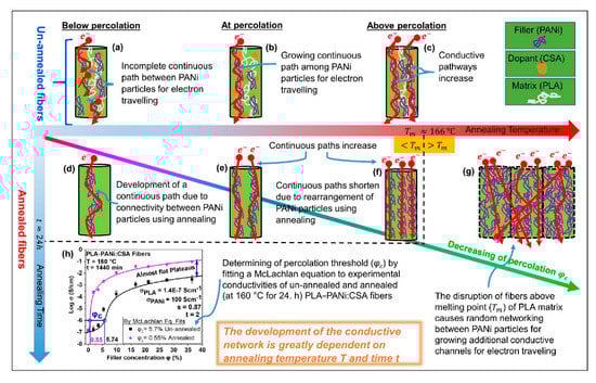The schematic representation of percolation phenomena within conductive fibers of PLA-PANi:CSA is shown in Figure 2, where PLA and PANi act as matrix chains and filler particles, respectively. Below percolation (Figure 2a), there is no continuous path between PANi particles for electron traveling. At percolation (Figure 2b), the growth of the continuous path between PANi particles leads to a steep increase in the electrical conductivity of fibers. Above percolation (Figure 2c), continuous pathways increase until the conductivity of fibers becomes constant. During the annealing process, continuous paths between PANi particles develop below percolation (Figure 2d) and surge at and above percolation (Figure 2e,f). The annealing above the melting point of the PLA matrix (Tm > 166 °C) causes disruption of fibers and random networking between PANi particles, which leads to higher growth of additional conductive channels with a lowering percolation threshold (as schematically shown in Figure 2g). During the annealing process, the molecular chains of the PLA matrix become more relaxed, and PANi particles acquire a certain degree of freedom to interconnect/reorganize themselves. This reorganizing (intermingling) of ICPs generates more paths and additional conductive channels, which are responsible for higher conductivity with lower percolation threshold φc []. The values of φc were determined by fitting the McLachlan GEM equation to experimental conductivities of un-annealed and annealed PLA-PANi:CSA fibers. The percolation threshold of annealed PLA-PANi:CSA fibers at 160 °C for 24 h is φc = 0.55%, which is one-tenth that of un-annealed fibers (φc = 5.7%), as shown in Figure 2h.