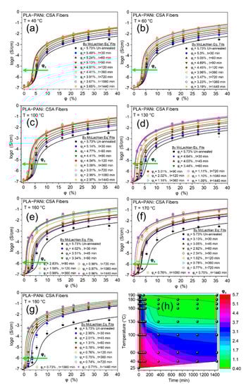 Logarithm of conductivity (log σ) against percentage volume fraction (φ %) of PANi for PLA-PANi:CSA fibers. (a–g) show the time-temperature dependence on percolation threshold φc. The solid lines show the closest fits with the GEM model (Equation (1b)). (h) shows the contour plot representation between time, temperature, and φc.