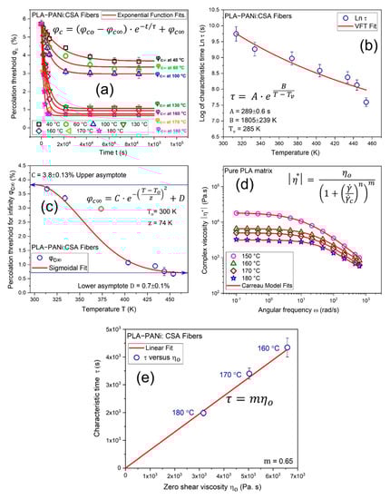 (a) shows an exponential function (Equation (5)) fit to determine infinite percolation threshold φc∞ and characteristic time τ. (b) shows a semi-logarithmic representation of the characteristic time τ as a function of temperature T, where the red solid line is a fit of the Vogel–Fulcher–Tammann (VFT) equation (Equation (6)). (c) shows a fit of sigmoidal function (Equation (7)) to describe φc∞ as a limit of temperature T. (d) shows the viscosity curve of PLA in relation to shear rate at 150, 160, 180, and 180 °C and a Carreau model (Equation (8)) is fitted to determine the zero-shear viscosity ηo. (e) shows the linear dependence between characteristic time τ and zero-shear viscosity ηo, and the linear fit is with intercept c = 0.