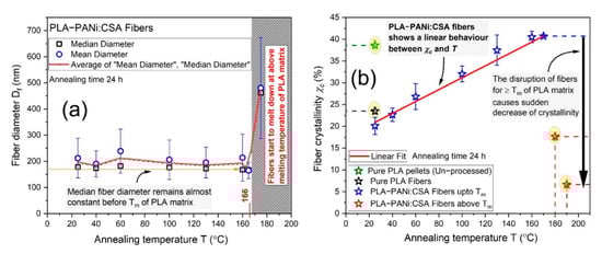 Figure 5a shows the diameter analysis of PLA-PANi:CSA fibers for consecutive annealing temperatures up to and above the melting point of matrix polymer PLA. Moreover, at each annealing temperature (from 25 to 175 °C), the SEM image with its box plot analysis for median and mean fiber diameters was determined and shown in Supporting Information in Section S8. The median fiber diameter remains almost constant below the melting point of PLA. To study the dependence of the crystallinity on the temperature, differential scanning calorimetry (DSC) was used. The degree of crystallinity (χc) was calculated using Equation (9) [], and a detailed discussion of measurements and calculations of thermodynamic characteristics with DSC thermograms can be found in the Supporting Information in Section S14.