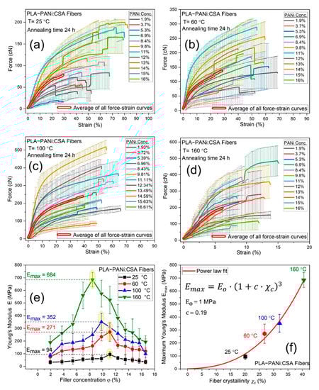 (a–d) show the force-strain curves for PLA-PANi:CSA fibers using 25, 60, 100, and 160 °C annealing temperatures, respectively. The percentage volume fraction (φ %) of PANi varies from 0% to 16%. The bold double red lines (in (a–d)) represent the average of all force-strain curves with common X range. (e) shows elastic Young’s modulus E as a function of percentage volume fraction (φ %) of PANi for PLA-PANi:CSA fibers at 25, 60, 100, and 160 °C annealing temperatures. (f) shows a power law correlation between maximum Young’s modulus Emax and fiber crystallinity χc.