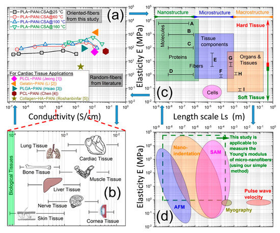 (a) shows a comparative study comparing the conductivities and Young’s moduli (elasticity) of our fabricated highly aligned conductive PLA-PANi:CSA fibers with other random conductive fibers, which have been reported in the literature for cardiac tissue engineering. (b) shows conductivity values of biological tissues, and values are expressed in S/cm []. (c) shows the length scale and elastic properties of soft tissues and their structural components. Superimposed are measurements of the elastic moduli of the aorta and ECM components at macroscopic, microscopic, and molecular length scales; A: single collagen fibrils [], B: fibrillary collagen [], C: fibrilin microfibrils [], D: elastin [], E. ferret aorta components [], F: porcine aorta components [], G: human radial artery [], H: rat aorta [], I: human aorta []. “Reproduced with permission Ref. [] 2022, Riaz Akhtar” (d) schematic diagram illustrating the elastic modulus range and length scale of the typical spatial resolution attainable using a number of mechanical testing methods that have been successfully used with soft tissue samples. “Reproduced with permission Ref. [] 2022, Riaz Akhtar”