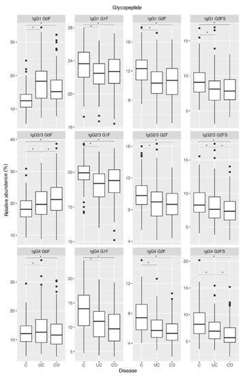 - Clerc, F.; Novokmet, M.; Dotz, V.; Reiding, K.R.; de Haan, N.; Kammeijer, G.S.M.; Dalebout, H.; Bladergroen, M.R.; Vukovic, F.; Rapp, E.; et al. Plasma N-Glycan Signatures Are Associated with Features of Inflammatory Bowel Diseases. Gastroenterology 2018, 155, 829–843. [Google Scholar] [CrossRef] [PubMed]