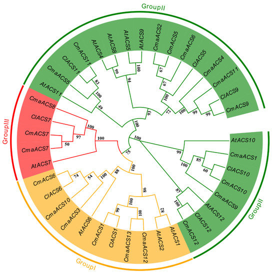 Studies have shown that amino acid residues play a key role in enzyme activity [33]. The 13 ACS proteins identified were subjected to sequence alignment (Figure S1). All ACSs contained seven conserved regions found in the ACS of Arabidopsis, tomato, and other plant species. In ACSs, the amino acid residues in two regions (II and VII) are particularly conserved; therefore, changes in these amino acids may lead to different functions. To further evaluate the evolution of the ACS gene family, MEGA-X software was used to construct a phylogenetic tree of the full-length protein sequences of 41 ACS genes from three cucurbit species (melon, watermelon, and pumpkin) and Arabidopsis (Figure 1). The ACS proteins of C. maxima can be classified into three groups. Strikingly, the members of group II formed two different branches on the phylogenetic tree instead of clustering on the same branch, which may be due to their different motifs at the N-terminus [34] (Figure S1). CmaACS1 and CmaACS9 were closely matched to AtACS10 and AtACS12, which are presumed to be amino acid transferases without ACS activity [25].