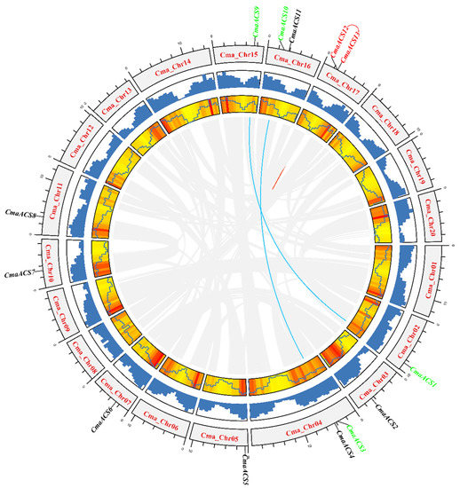 Chromosomal distribution of CmaACS genes. From the outside to the inside, the first circle represents chromosome coordinates; the second and third circles represent gene density distribution; blue or red lines connect gene pairs.