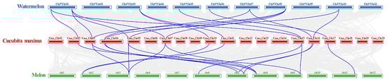 Synteny analysis of ACSs in watermelon, melon, and C. maxima. The blue lines represent the syntenic ACS pairs between the two genomes. The chromosome number is shown at the top of each chromosome.