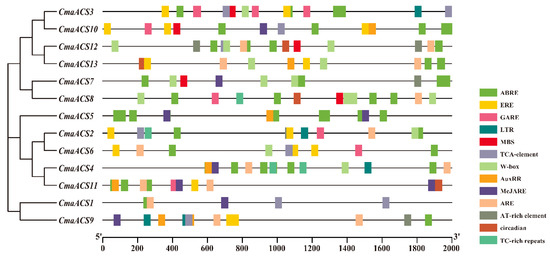 Predicting the cis-elements in promoters that regulate gene expression is essential for improving the understanding of gene regulation [35]. We studied the 2000 bp sequence upstream of the initiation codon of each CmaACS gene, analyzed its cis-elements online via PlantCARE tools (http://bioinformatics.psb.ugent.be/webtools/plantcare/html/, accessed on 27 August 2021), and isolated the functional unknown elements and general transcriptional regulatory elements. As shown in Figure 5, various cis-elements related to stress and plant hormone responses were detected in these ACS genes, such as abscisic acid-responsive elements (ABREs), gibberellin-responsive elements (GARE motifs), salicylic acid-responsive elements (TCA elements), MeJARE-responsive elements (MeJAREs), auxin-responsive elements (AuxRRs), and ethylene-responsive elements (EREs and W-boxes). Stress-related elements, including AREs, LTRs, MBSs, AT-rich-elements, circadian-related elements, and TC-rich repeats, were present in a small number of ACS genes. Most hormone- and stress-responsive elements were present upstream of a specific small number of CmaACS genes, suggesting that these elements play key roles in the response to hormones and in stress response mechanisms.