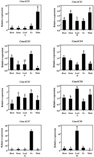 To understand the potential function of specific ACS isozymes in pumpkin, we analyzed the tissue-specific expression patterns of the CmaACS genes in different tissues of pumpkin. The results showed that the 13 CmaACS genes were differentially expressed in the roots, stems, leaves, female flowers, and male flowers. CmaACS1, CmaACS4, CmaACS7, and CmaACS9 were specifically and highly expressed in the male and female flowers. Although CmaACS3 and CmaACS5 were highly expressed in the female flowers, the expression was not significantly different from that in the other organs. CmaACS8 and CmaACS11 were highly expressed in the leaves, CmaACS12 and CmaACS13 were specifically expressed in the roots, and the expression of the other genes was not significantly different across the various organs (Figure 6). Interestingly, a relatively strong expression of four CmaACSs (CmaACS1, CmaACS4, CmaACS7, and CmaACS9) was observed in the female and male flowers of subgynoecious pumpkin, suggesting that the different expression patterns were associated with flower development.