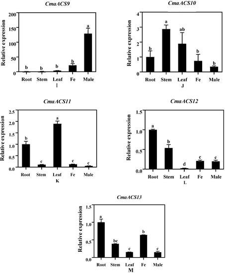 Expression patterns of CmaACS genes in different tissues. (A–M) Relative expression levels of ACS gene family members in different tissues. Means followed by a different letter in each column are statistically different by SSR’s test at p > 0.05.