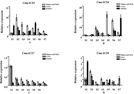 Comparison of expression patterns of CmaACS1 (A), CmaACS4 (B), CmaACS7 (C), and CmaACS9 (D) at different flower development stages.