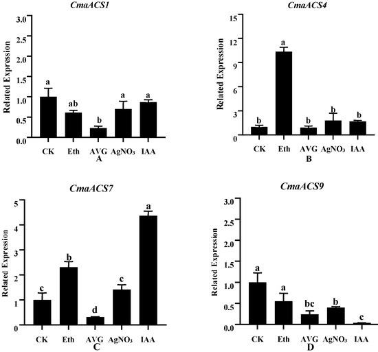 Comparison of expression patterns of CmaACS1 (A), CmaACS4 (B), CmaACS7 (C), and CmaACS9 (D) Under Different Hormone Treatments. Means followed by a different letter in each column are statistically different by SSR’s test at p > 0.05.