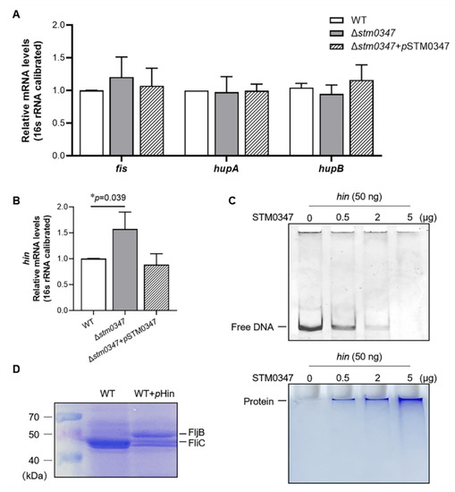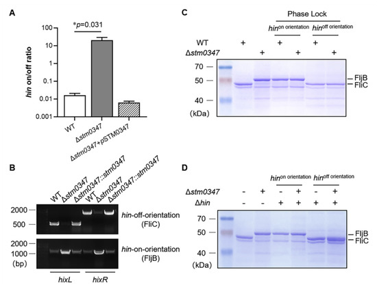 Chicago/Turabian StyleWang, Hongou, Zhiheng Tang, Baoshuai Xue, Qinghui Lu, Xiaoyun Liu, and Qinghua Zou. 2022. "Salmonella Regulator STM0347 Mediates Flagellar Phase Variation via Hin Invertase" International Journal of Molecular Sciences 23, no. 15: 8481. https://doi.org/10.3390/ijms23158481