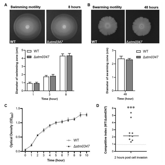 2.6. ΔSTM0347 Deletion Disadvantages S. Typhimurium for Cell Invasion