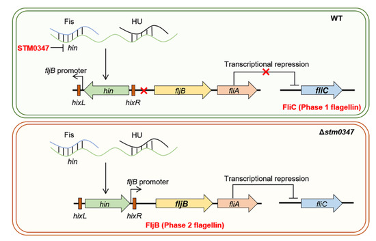 Wang, H.; Tang, Z.; Xue, B.; Lu, Q.; Liu, X.; Zou, Q. Salmonella Regulator STM0347 Mediates Flagellar Phase Variation via Hin Invertase. Int. J. Mol. Sci. 2022, 23, 8481. https://doi.org/10.3390/ijms23158481