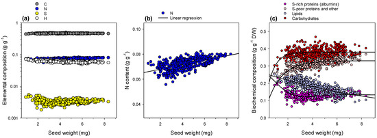 Seed composition. Elemental composition (a) measured by elemental analysis, in carbon, nitrogen, sulphur and hydrogen, in mass fraction (note the logarithmic scale to make the four elements of interest more easily visible). (b) Magnification of the relationship between N content and seed weight. The black line stands for a linear regression (R2 = 0.36, p < 0.001). (c) Biochemical composition in proteins, lipids and carbohydrates calculated from elemental composition. Thick black lines stand for exponential trends, exponential decay or raise to maximum (in all cases, R2 > 0.96, p < 0.0001). In (c), major compounds considered are S-rich proteins (albumin type), other nitrogenous compounds (including S-poor proteins, such as vicilins and legumins), total lipids and carbohydrates (both structural and non-structural). Elemental data are plotted against accessions in Supplementary Figure S1.