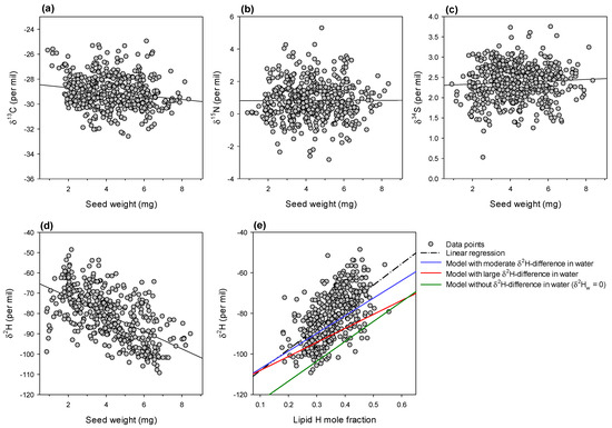 Seed isotope composition (previous page). Natural abundance in 13C (a), 15N (b), 34S (c) and deuterium (2H) (d) in seeds, plotted against seed weight. Black lines stand for linear regressions (insignificant for 13C, 15N and 34S; significant for 2H, R2 = 0.33, p < 0.0001). (e) Relationship between hydrogen isotope composition and hydrogen mole fraction represented by lipids in seeds. The dash-dotted black line stands for the linear regression (R2 = 0.38, p < 0.0001), while the coloured solid lines represent the predicted δ2H using isotopic mass–balance models.