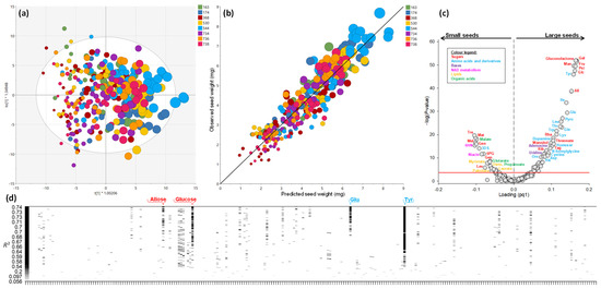 The exact mass GC–MS metabolomics of individual seeds was carried out to examine metabolic differences between seeds. All data were expressed relative to seed weight to facilitate result analysis. That is, should a metabolite be in constant amount (i.e., quantity per mg weight) and thus scale proportionally, it should appear as insignificant in subsequent correlation analysis with seed weight. Metabolomics allowed us to identify and quantify 244 analytes (full list in Supplementary Table S1). Multivariate supervised statistics via orthogonal projection on latent structures (OPLS) were performed to look at relationships with seed weight (used as the Y continuous response variable). Despite a few samples standing outside the Hotelling’s ellipse, the OPLS model was highly significant (PCV-ANOVA < 10−20), explicative (R2 = 0.85) and predictive (Q2 = 0.76), and seed weight was well aligned along axis 1 (Figure 3a). The orthogonal dimension (axis 2) reflected biological variability unrelated to genetics (no discrimination between accessions). Similarly, multivariate non-supervised analysis by principal component analysis (PCA) was also efficient in discriminating seed weight and did not show sample grouping by accession (Supplementary Figure S2a,b).