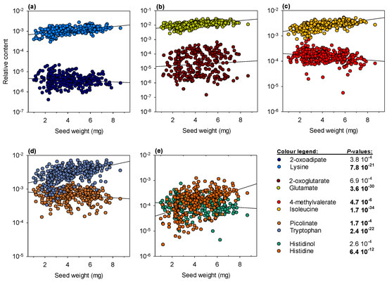To obtain more insight on amino acid metabolism, specific degradation products that could be identified by GC–MS were plotted separately (Figure 4). Selected products include 2-oxoadipate (produced by lysine degradation), 2-oxoglutarate (produced by glutamate transamination), 4-methylvalerate (produced by isoleucine degradation), picolinate (produced by tryptophan degradation) and histidinol (produced by histidine degradation). In all cases, degradation products were more abundant as seed weight decreased, unlike their amino acid counterparts, except for 2-oxoglutarate, which tended to increase slightly. Overall, it indicates a general up-regulation of amino acid catabolism in small seeds.