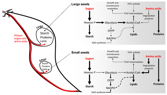 Here, the concurrent change in amino acid and sugar metabolism (Figure 3c and Figure 4) strongly suggests a rerouting of amino acid utilisation towards lipid synthesis in small seeds (illustrated in Figure 5). In effect, the relatively modest change in carbohydrates suggests that sugars are preferentially used to store starch at the expense of generation of acetyl-CoA (via glycolysis) during small seed development. This is in agreement with the larger content in sugars that play a role in the control of starch metabolism: in particular, trehalose (Figure 3c) may reflect an increased degradation of trehalose 6-phosphate, an important sugar signal that regulates seed size and the conversion of sucrose into starch [38]. Amino acid degradation then sustains acetyl-CoA synthesis and lipid production. In principle, this should be detrimental to proteins (and thus N content) and lead to a higher carbon cost (CO2 production), exaggerating further seed weight limitation. Accrued lipid synthesis requires redox power (NADPH) for fatty acid production, generated from the oxidative pentose phosphate pathway (OPPP), explaining why NAD intermediates are found to be more abundant along with the OPPP intermediate 6-phoshogluconate in small seeds. The intermediates of the OPPP (such as erythrose 4-phosphate) are probably recycled into aromatic compounds, as suggested by 3-dehydroshikimate increase, along with anthranilic acid (p = 10−2.18) and salicylate (p = 10−4.91) in small seeds. Additionally, anaplerotic fixation (i.e., PEPC activity producing C4 acids to sustain the tricarboxylic acid cycle) has been suggested to be linked to lipid synthesis in Legume seeds [39,40] and accordingly, we find more malate in lipid-rich, small seeds. Taken as a whole, we observe a broad metabolic reorchestration accompanying seed weight, reflecting a compromise to maintain carbohydrates and adjust the protein–lipid balance, a well-known phenomenon found in Legumes under various conditions affecting C/N nutrition [41,42,43,44,45,46,47,48].